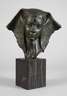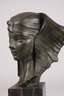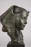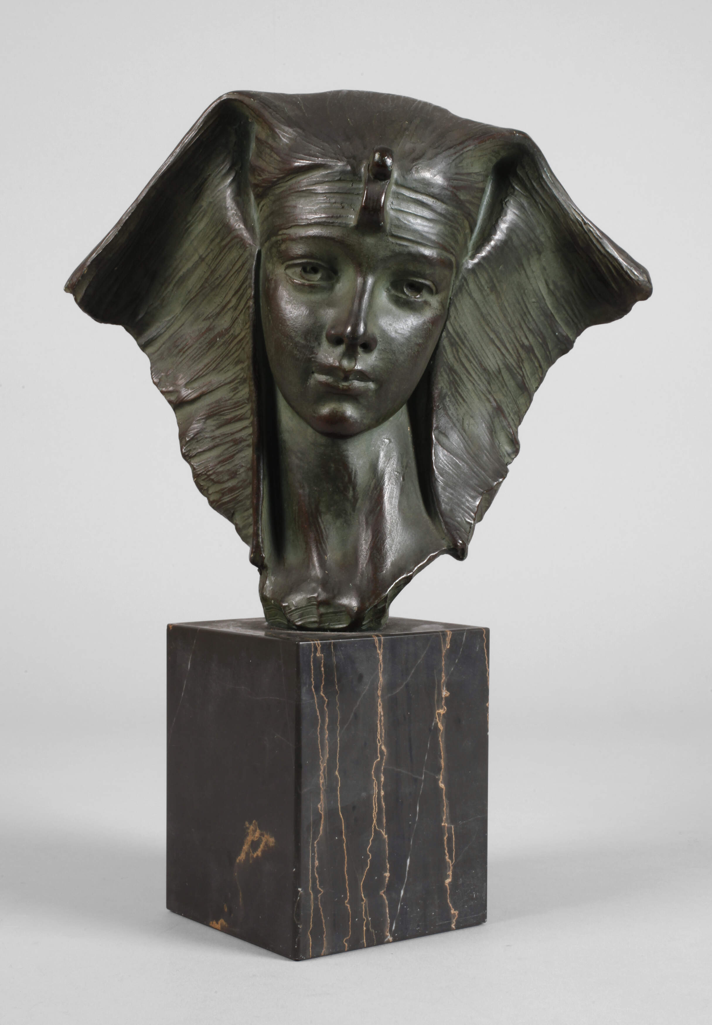 um 1900, verso signiert und nummeriert 2304, Terrakotta dunkelbraun und grün bemalt, Kopfdarstellung einer jungen Ägypterin mit dem typischen Nemes-Kopftuch der Pharaonen, den Kopf leicht zur Seite geneigt, den Betrachter abwartend anschauend, auf dunklen Onyxsockel montiert, Farbfassung partiell mit winzigsten Bereibungen, H Büste 22,5 cm, H gesamt 35 cm. Künstlerinfo: belgischer Bildhauer (1878 bis 1955). Quelle: Internet.