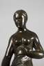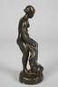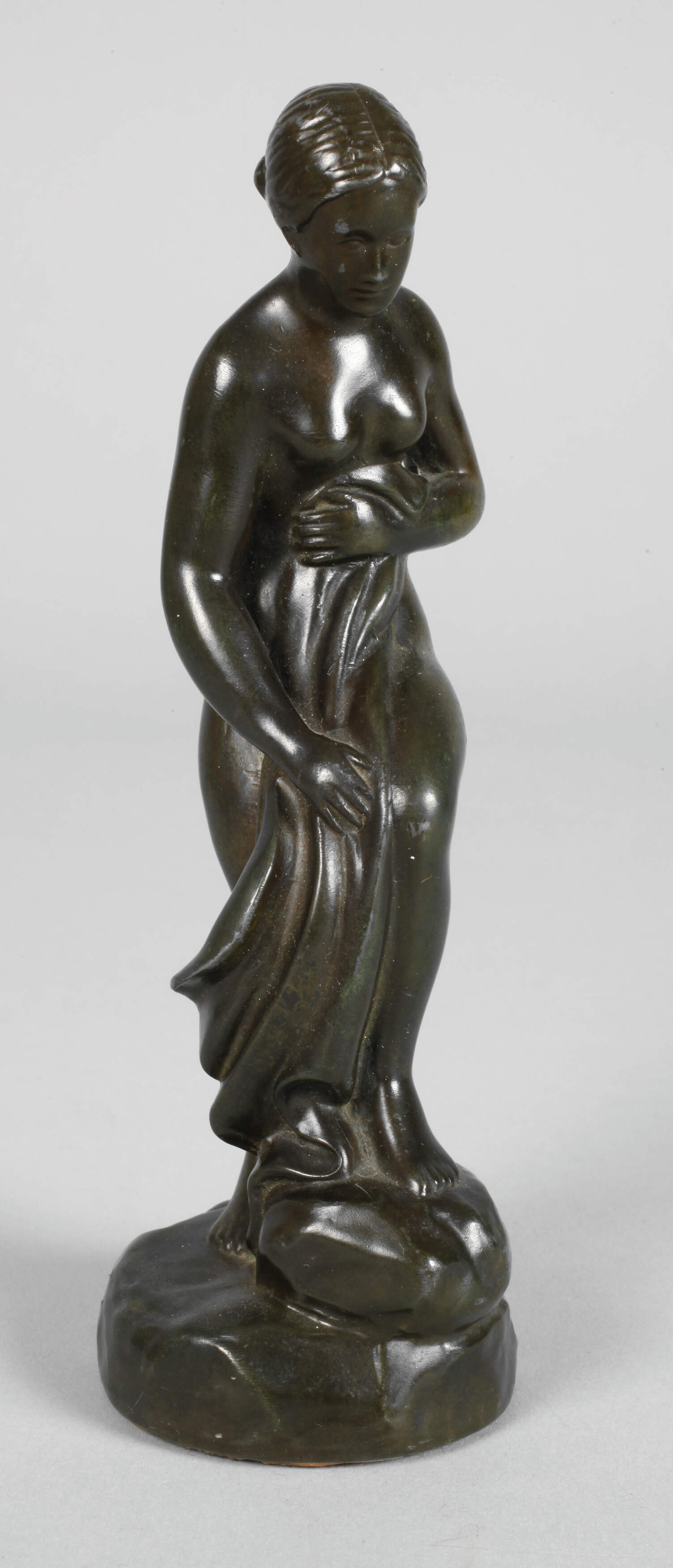 1. Drittel 20. Jh., signiert Just A, Modellnummer D2100, Metallguss nuanciert dunkelgrün und braun patiniert, nackte junge Frau an kleinem Felsen, sich mit einem Tuch abtrocknend, Patina mit kleinen Verlusten, H 15,5 cm. Künstlerinfo: dänischer Bildhauer und Silberschmied (1884 Godhavn bis 1943 Glostrup), lernte bei Hans Christian Lamberg Petersen das Handwerk des Ornamentbildhauers, ab 1910 Studium an der Königlich Dänischen Kunstakademie, ab 1912 Studium bei Jens Møller-Jensen an der Schule für Kunst und Handwerk (heute Dänische Designschule) in Kopenhagen, arbeitete zu Beginn seiner Kariere für den Silberschmied Georg Arthur Jensen, den Juwelier Anton Michelsen und den Goldschmied Peter Hertz, arbeitete drei Jahre an einem Altar in der Kopenhagener Sakramentskirche unter der Leitung von Mogens Ballin, ab 1918 tätig mit eigener Firma Just Andersen Zinn, ab 1929 Umfirmierung in eine Aktiengesellschaft, seine Witwe führte sein Unternehmen bis zu ihrem Tod 1973 weiter.