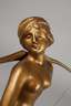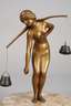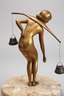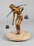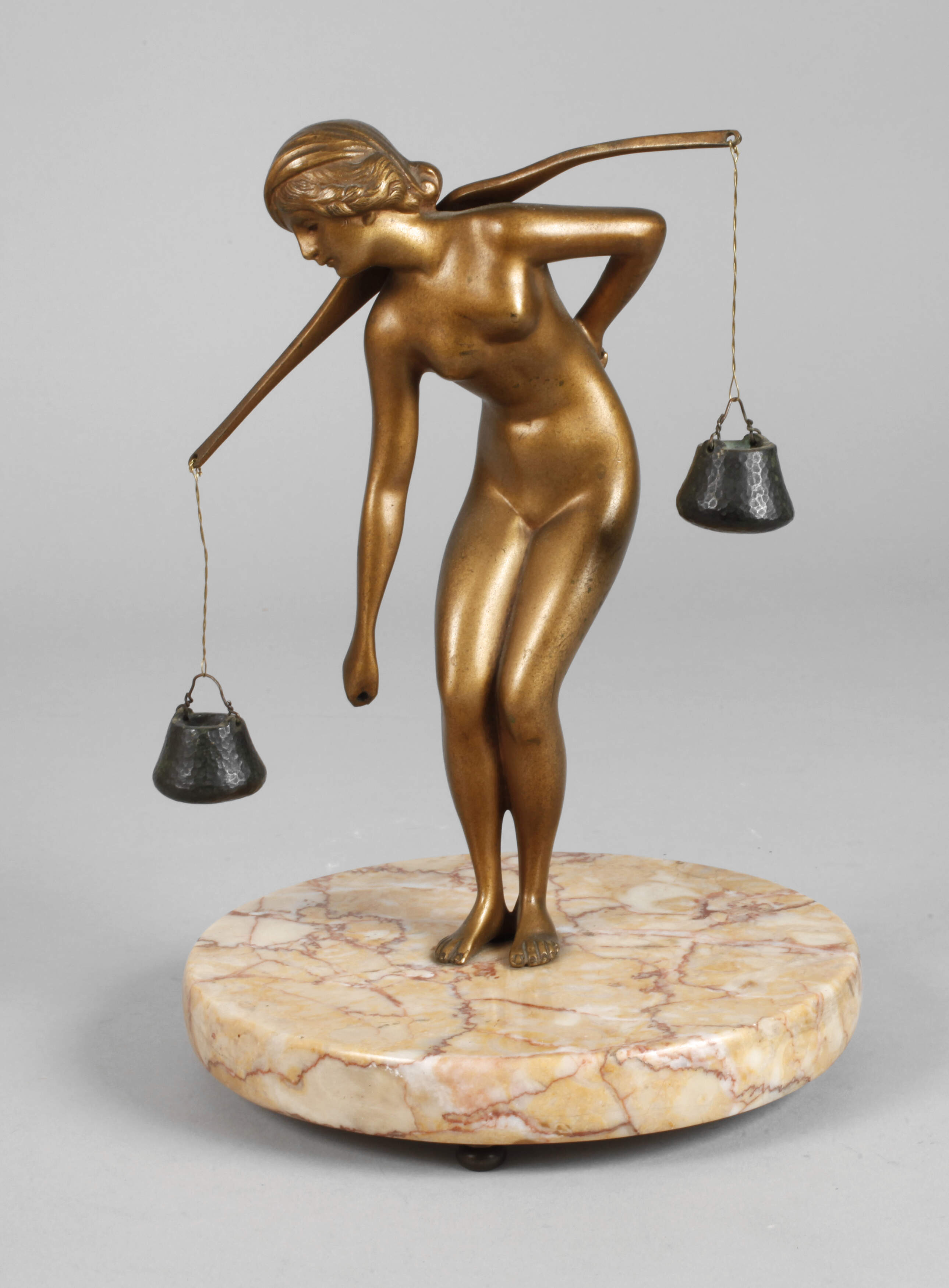 um 1900, unsigniert, Bronze dunkel patiniert, wohl später goldbronziert, weiblicher Akt mit Haarknoten und Kopftuch, in gebeugter Haltung zwei schwere Wassereimer an einem Tragjoch tragend, auf Marmorsockel montiert, dieser auf drei angedeuteten Bronzefüßen stehend, Befestigungen der Eimer erneuert, Alters- und Gebrauchsspuren, H Bronze 21 cm, H gesamt 24 cm. Künstlerinfo: Bildhauer in Berlin (1862 bis 1935), war mit Portraitbüsten und Genrefiguren oft auf Berliner Ausstellungen vertreten (mehrere Akademieausstellungen, internationale Ausstellung 1891 und große Kunstausstellung 1893), beteiligte sich 1886 ohne Erfolg an der Konkurrenz um das Berliner Lessingdenkmal. Quelle: Thieme-Becker, Vollmer, Allgemeines Lexikon der Bildenden Künstler, Verlag Seemann Henschel GmbH & Co. KG.