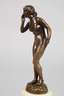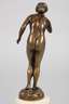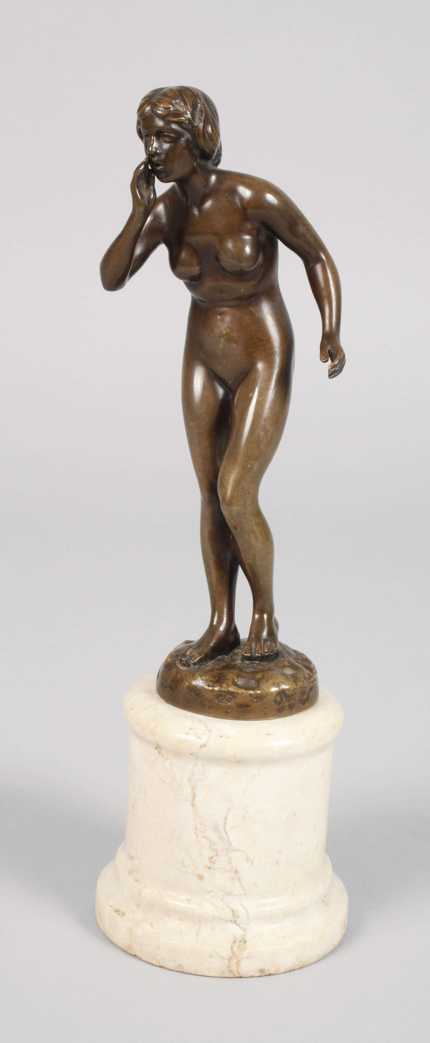 um 1900, verso signiert H. Rieder, Bronze braun patiniert, stehende nackte Jugendstilschönheit mit elegantem Haarknoten, eine Hand zum Ruf an den Mund geführt, auf kleiner, naturalistisch gestalteter Plinthe, auf hohen postamentartigen Marmorsockel montiert, dieser an der Unterkante mit kleinen Kerben, H Bronze 18 cm, H gesamt 26 cm. Künstlerinfo: deutscher Bildhauer des 19./20. Jh. Quelle: Internet.
