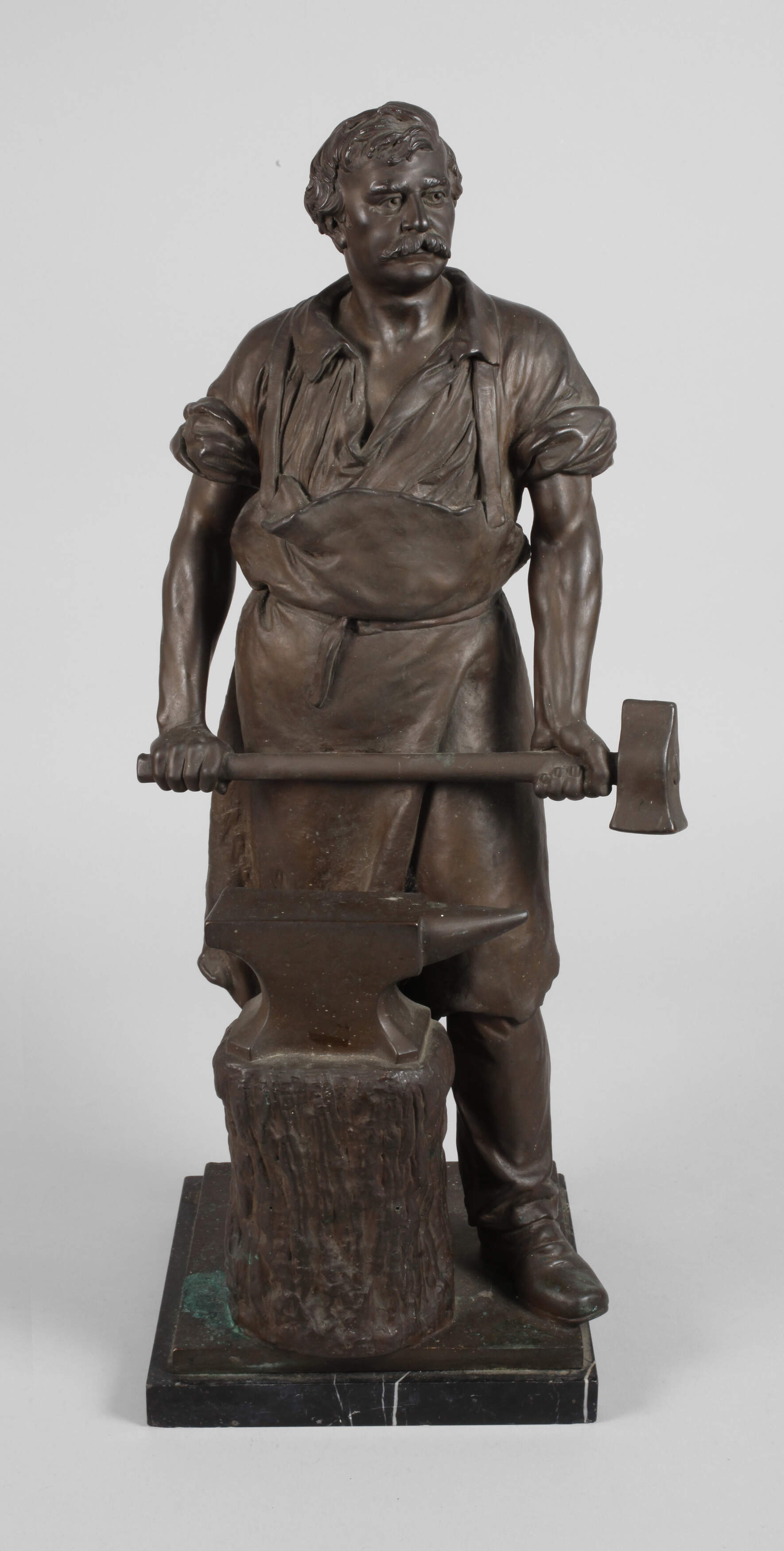 Ende 19. Jh., auf der Plinthe signiert Schmiemann, Stukko galvanisch verkupfert und dunkelbraun patiniert, Schmied in Arbeitskleidung, mit Schmiedeschürze und mit Hammer vor seinem Amboss, auf Marmorsockel montiert, Plinthe grünspanig, sonst altersgemäß gut erhalten, H Skulptur 59,5 cm, H gesamt 63 cm. Künstlerinfo: deutscher Bildhauer (1846 Münster bis 1927 ebenda), bekannt für seine sakralen Werke, schuf jedoch auch profane Werke, Lehre zum Bildhauer, studierte an der Technischen Hochschule in Hannover unter Professor Doppmeier, in Amsterdam bei Professor Stracke an der Kunstschule „Felix Meritis“, danach an der Berliner Kunstakademie unter Professor Pohlmanns. Quelle: wikipedia.de
