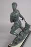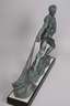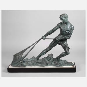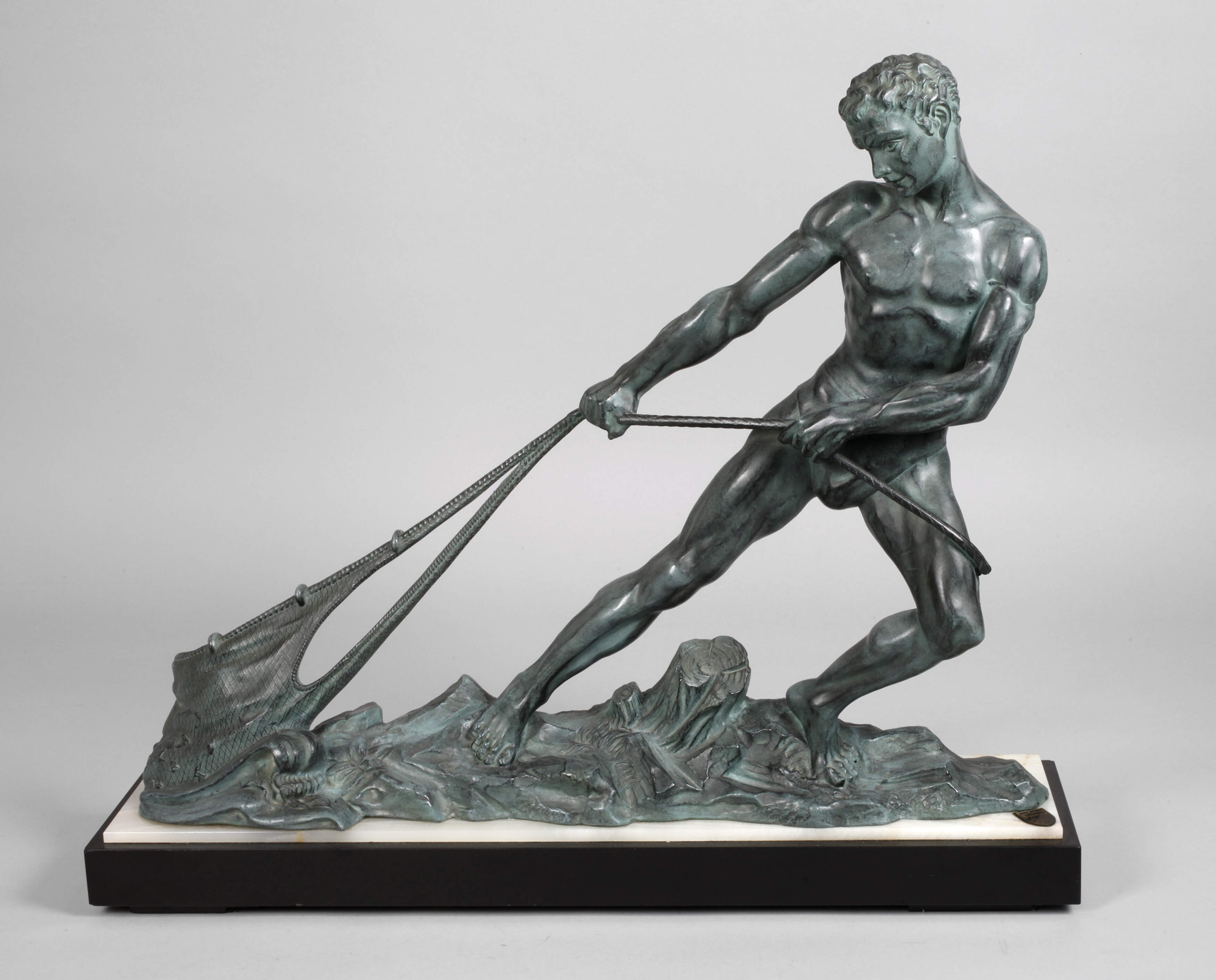 um 1930, mit Plakette Les Maitres Bronziers Cristean, unsigniert, Metallguss in grauer und grüner Kaltbemalung, kraftvolle Darstellung eines jungen Mannes im Lendenschurz, sein mit Fischen gefülltes Netz vom Ufer aus einholend, auf naturalistisch gestalteter Plinthe mit Wellen und Felsen sowie Baumstümpfen, auf mehrteiligem, mehrfarbigem Onyxsockel, dieser mit Chips, sonst normale Altersspuren, H Skulptur 50 cm, H gesamt 55 cm. Künstlerinfo: belgischer Bildhauer (tätig ca. 1918 bis 1940). Quelle: Internet.