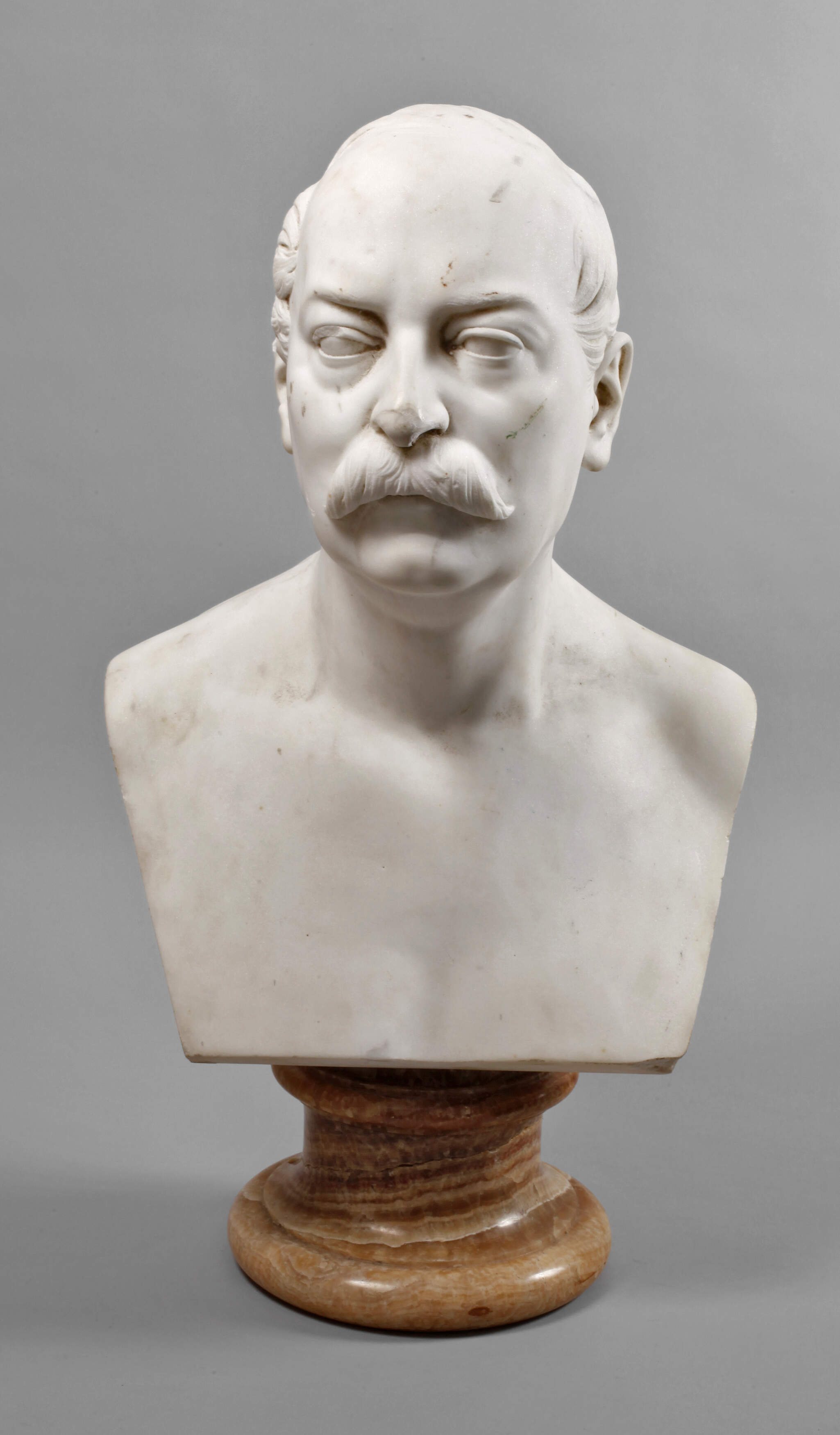 datiert 1865, monogrammiert HG, Marmor, Brustdarstellung eines Mannes mit Schnauzbart, wohl des Komponisten Robert Volkmann (1815–1883), der sich in den 1860er Jahren wachsender internationaler Beliebtheit erfreute, auf Marmorsockel, Nase und Schulter restauriert, ein Ohr beschädigt, weitere kleinere Blessuren, H Büste 55 cm, H gesamt 70 cm. Künstlerinfo: österreichischer Bildhauer (1817 Eisentratten in Kärnten bis 1868 Budapest), Sohn eines Kunsttischlers und Holzschneiders, besuchte ab 1838 die Wiener Akademie in der Zeichenklasse von Gsellhofer, ab 1840 in München, ab 1846 wieder in Wien, schuf Auftragsarbeiten für bedeutende Adelige (beispielsweise für Metternich und den Erzherzog Stefan von Österreich) und Werke für den öffentlichen Raum, erhielt eine Professur an der Wiener Akademie. Quelle: wikipedia.de sowie Thieme-Becker/Vollmer, Allgemeines Lexikon der Bildenden Künstler, Verlag Seemann Henschel GmbH & Co. KG.