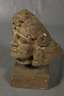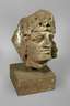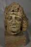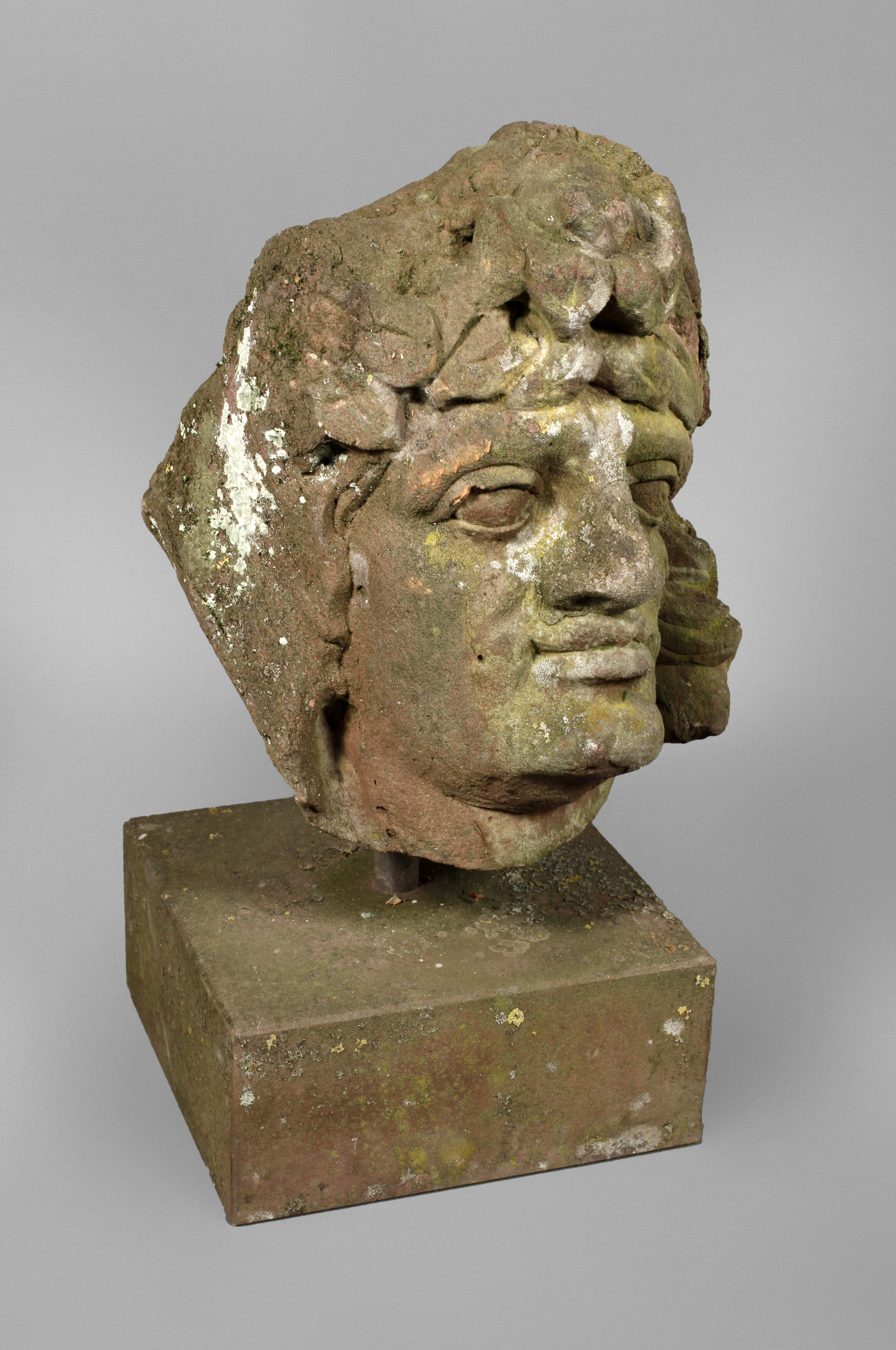 unbestimmten Alters, unsigniert, roter Sandstein, ehemals Teil einer Fassade, monumentaler männlicher Kopf, von Blüten bekränzt, rückseitig Spuren ehemaliger Wandmontage, auf passenden Sockel montiert, starke Witterungsspuren, H 49 cm. Info: dieses Objekt kann nur mit einer Spedition versendet werden.