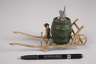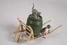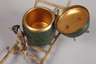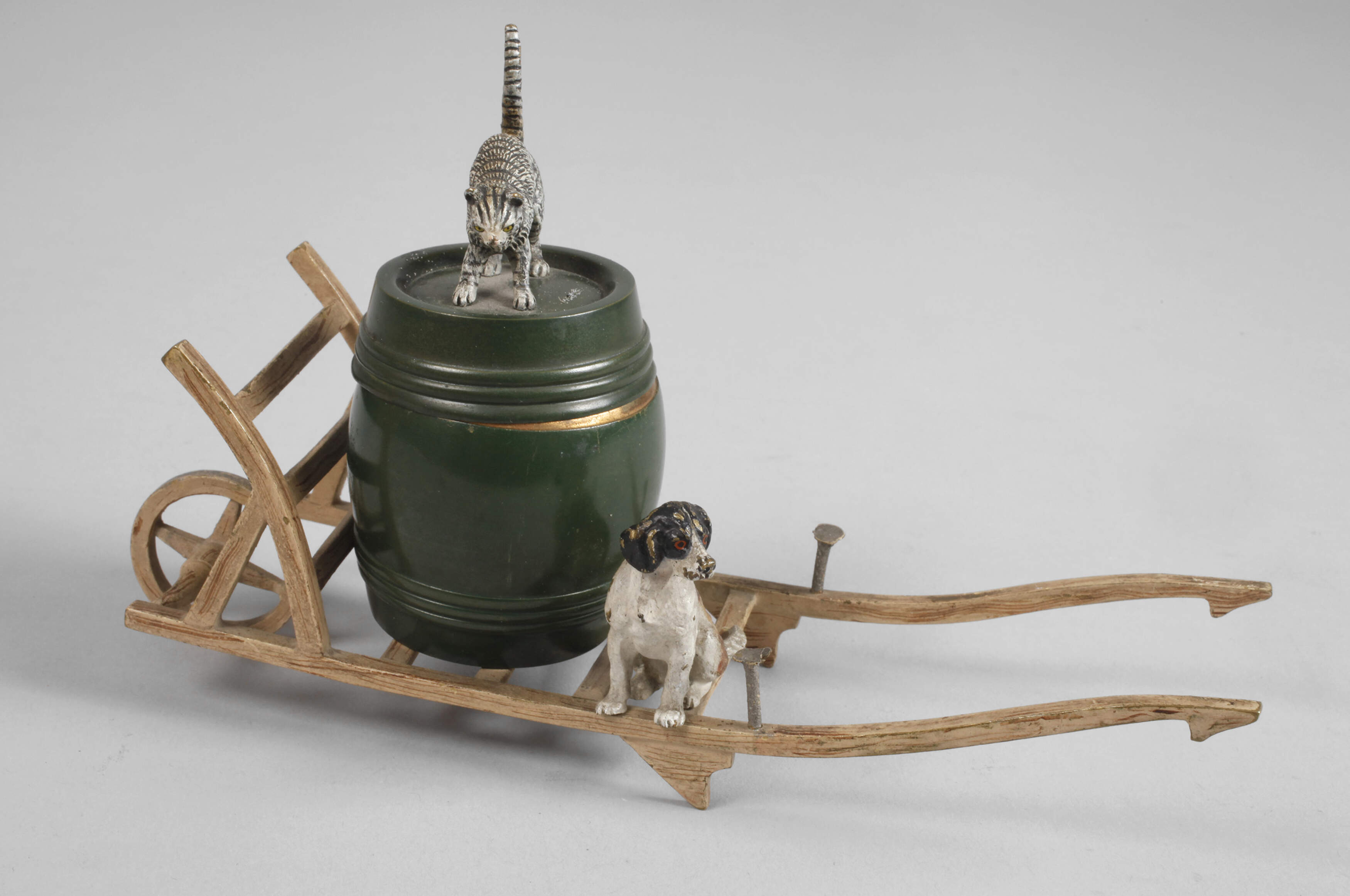 Ende 19. Jh., unsigniert, Bronze polychrom in Kaltbemalung staffiert, innen vergoldet, als Holzkarren mit Fass, darauf eine Katze stehend, daneben ein kleiner Hund, normale Altersspuren, L 19,5 cm.