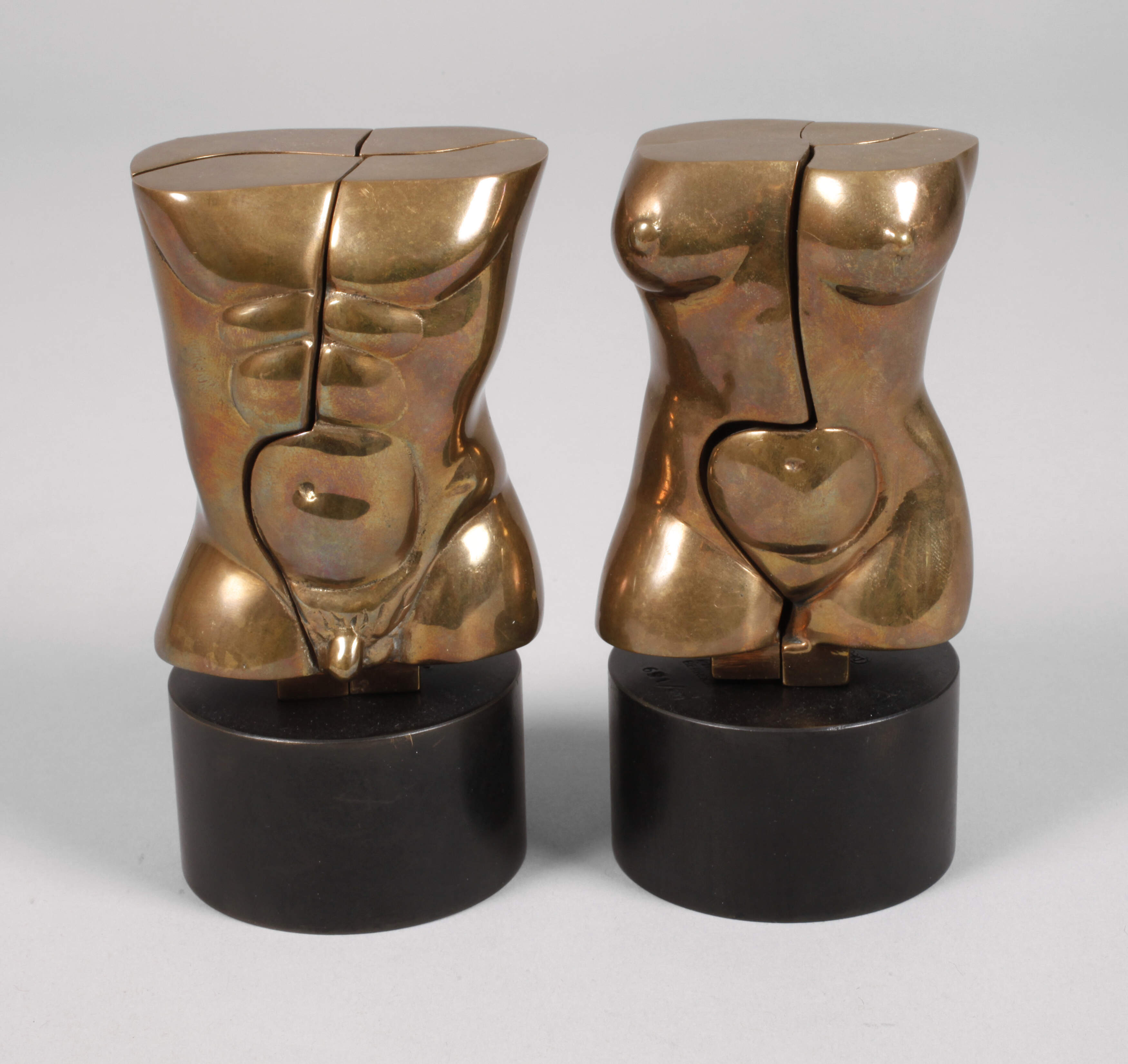 1987, auf dem Sockel signiert, Copyrightzeichen, nummeriert 691/999, Schriftzug venturi arte sowie Die Galerie, Bronze, jeweils mehrteilig asymmetrisch zusammengesetzte Torsi, ein männlicher und ein weiblicher Torso, auf dunkel patinierten Bronzesockeln, leichte Altersspuren, H Torsi je 9 cm, H gesamt je 12,5 cm. Künstlerinfo: spanischer Bildhauer (1933 in Algaidas, Provinz Málaga, Andalusien bis 2006 Antequera, Spanien), bekannt für seine abstrakten Puzzleskulpturen verschiedener Formate, die meist in viele ebenfalls abstrakte Teile zerlegt werden können und oft auch Schmuck enthalten, schloss ein Architekturstudium in Madrid ab, besuchte die Academia de Bellas Artes de San Fernando, die Escuela de Artes Graficas und die Abendschule Escuela de Artes y Oficios, interessierte sich stark für analytische Geometrie, stellte weltweit aus und übte seine Kunst bis zu seinem plötzlichen Tod aus. Quelle: Internet.