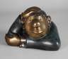 20. Jh., signiert Loriot, Gießerstempel Ara Bildguss, gestempelter Schriftzug arsmundi sowie Nummer 635/980, Bronze nuanciert in Braun- und Grüntönen patiniert, am Knopf poliert, die humoristische Antwort auf die berühmte gleichnamige Skulptur Rodins, Brustdarstellung eines etwas zerstreut dreinblickenden Mannes, einen Arm aufgestützt, die Hand grüblerisch auf dem Kopf ruhend, den andere Arm stützend auf dem Untergrund abgelegt, altersgemäß gut erhalten, H 15 cm. Künstlerinfo: bürgerlich Bernhard-Viktor „Vicco“ Christoph-Carl von Bülow, deutscher Karikaturist, Schauspieler, Moderator, Regisseur, Bühnen und Kostümbildner, Künstler (1923 Brandenburg/Havel bis 2011 Ammerland), einer der bekanntesten deutschen Humoristen und vielseitiger Künstler in Literatur, Zeitung, Film, Fernsehen, und Theater, erhielt 2003 eine Honorarprofessur an der Berliner Universität der Künste, er erhielt verschiedene militärische wie auch kunstkritische Preise z.B. Adolf-Grimme-Preis, Goldene Kamera, Bambi, Goldener Löwe, Deutscher Comedypreis usw., es wurden mehrere Ausstellungen zu seinen Ehren veranstaltet. Quelle: Wikipedia.