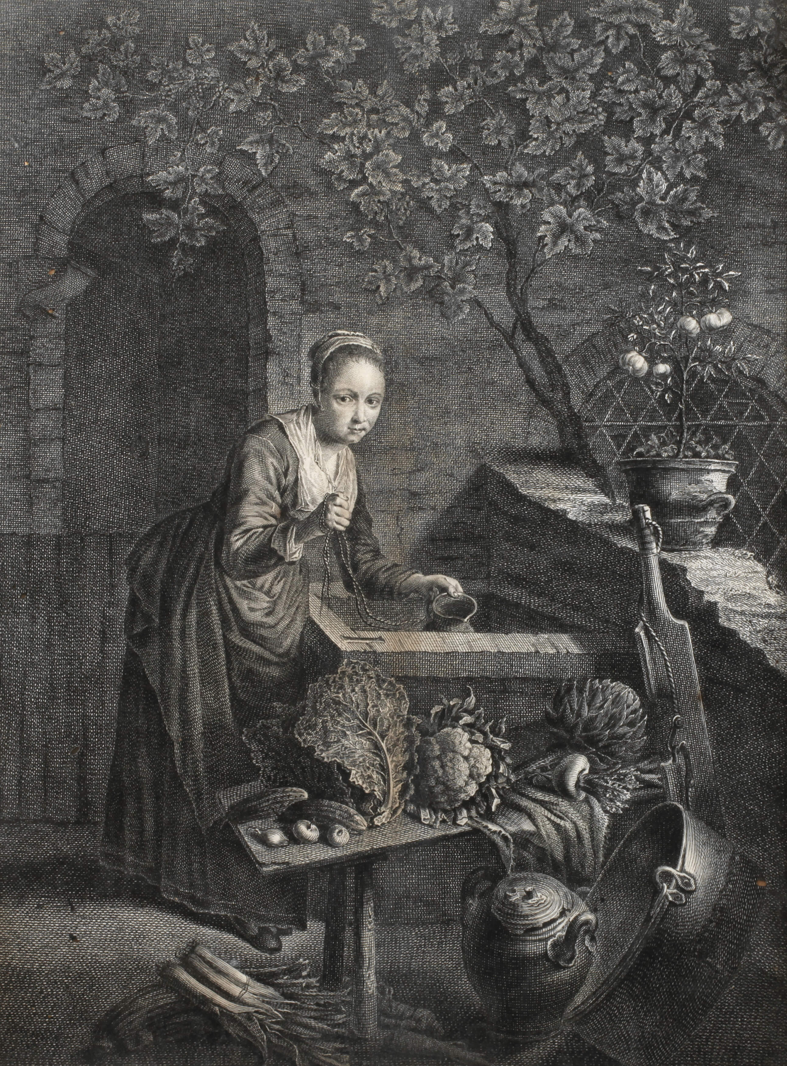 den Betrachter anblickende junge Dame beim Wasser aus einem Brunnen schöpfen und umgeben von verschiedenem Gemüse, Kupferstich, 2. Hälfte 18. Jh., Spuren von früherem Wurmfraß und etwas fleckig, hinter Glas in historischem Goldstuckrahmen, Falzmaße ca. 35,5 x 27 cm. Künstlerinfo: franz. Kupferstecher und Verleger (1723 Paris bis 1797 Paris), Schüler seines Cousins (oder Onkels) Etienne Fessard, später bei Jean Daullé, weitergebildet bei Pierre Jean Mariette, 1750-54 Mitarbeit am Galeriewerk "Gal. du Comte de Bruhl (Galerie des Grafen Brühl)" und "Gal. royale de Dresde (Die Königliche Galerie Dresden)", ab 1754 auch als Verleger tätig, vom Herzog von Choiseul als "le maréchal de saxe de la curiosite (der sächsische Marschall der Wissbegierde)" betitelt, veröffentlichte zahlreiche Stichfolgen, meist unter maßgeblicher Mitwirkung seiner Mitarbeiter nach holländischen und flämischen Meistern, tätig in Paris, Quelle: Thieme-Becker und AKL.