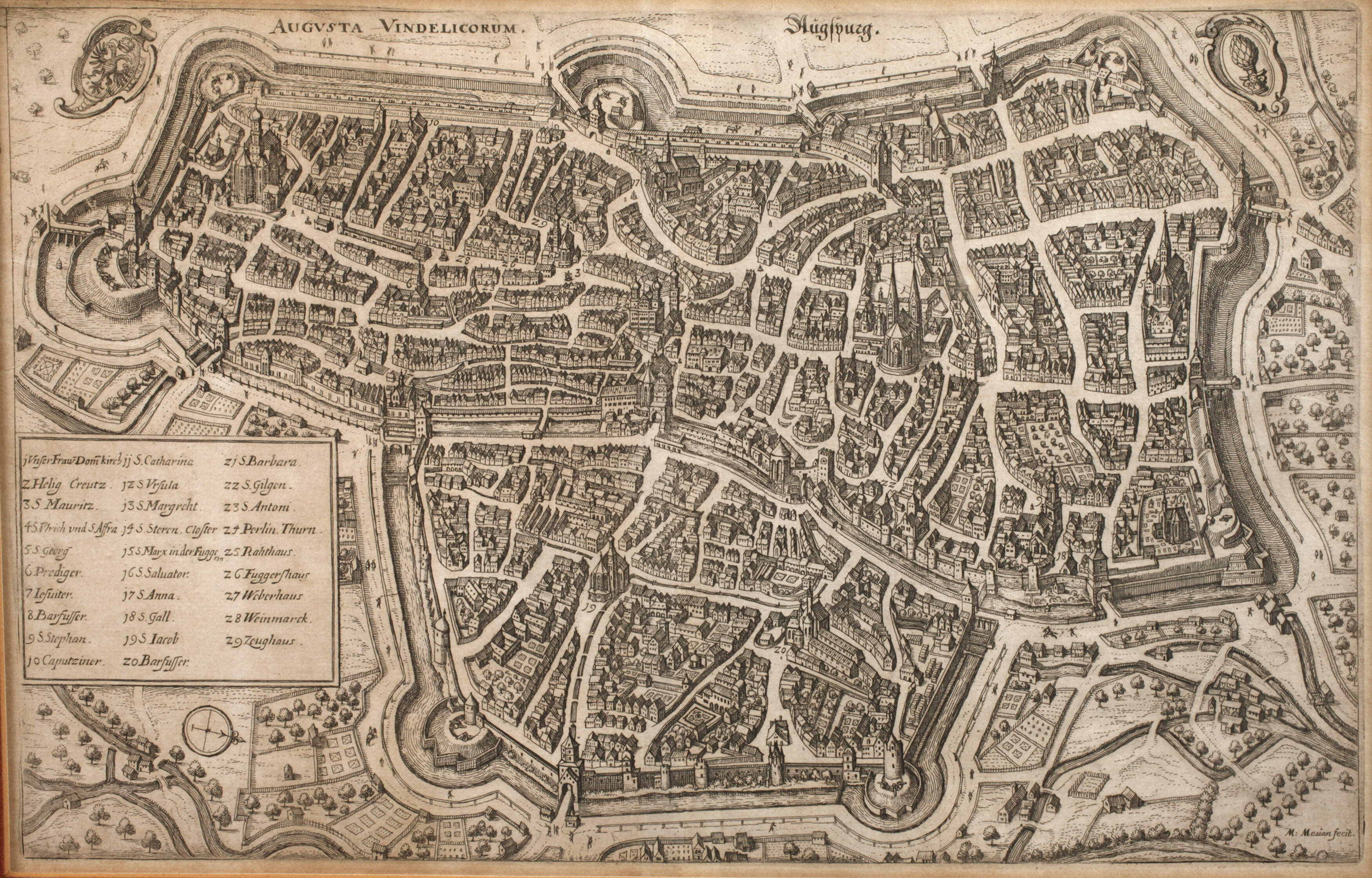 Blick aus der Vogelschau auf die Freie Reichsstadt Augsburg mit seinen Befestigungsanlagen, Häusern und bedeutenden Bauwerken, links Legende mit Bezeichnung der 29 bedeutendsten Bauwerke der Stadt wie die "Unser Fraw Domkirch [der Augsburger Hohe Dom Mariä Heimsuchung]" und führt neben dem Rathaus auch das Fuggerhaus und Zeughaus mit auf, oben lateinische und Deutsche Bezeichnung "Augusta Vindelicorum – Augspurg [sic.]", links oben das habsburgische Wappen und rechts oben Stadtwappen mit der Zirbelnuss auf einem Kapitell, rechts unten in der Platte signiert "M. Merian fecit", Kupferstich auf Bütten, lichtrandig, hinter Glas und Passepartout gerahmt, Plattenmaße ca. 20 x 31,5 cm. Künstlerinfo: schweizerischer Kupferstecher, Buchhändler und Verleger (1593 Basel bis 1650 Schwalbach), 1606–09 Schüler des Kupferstechers Dietrich Meyer und des Glasmalers Christof Murer in Zürich, 1610 bei Friedrich Brentel in Straßburg, 1625 Übernahme der Kunsthandlung seines Schwiegervaters Johann Theodor de Bry in Frankfurt am Main, nach seinem Tod führten seine Söhne Matthäus der Jüngere und Caspar sowie später deren Nachkommen den Verlag unter der Bezeichnung ”Merians Erben” bis 1727 weiter und vervollständigten seine Hauptwerke ”Topographia Germaniae” und ”Theatrum Europaeum”, Quelle: Thieme-Becker und Internet.