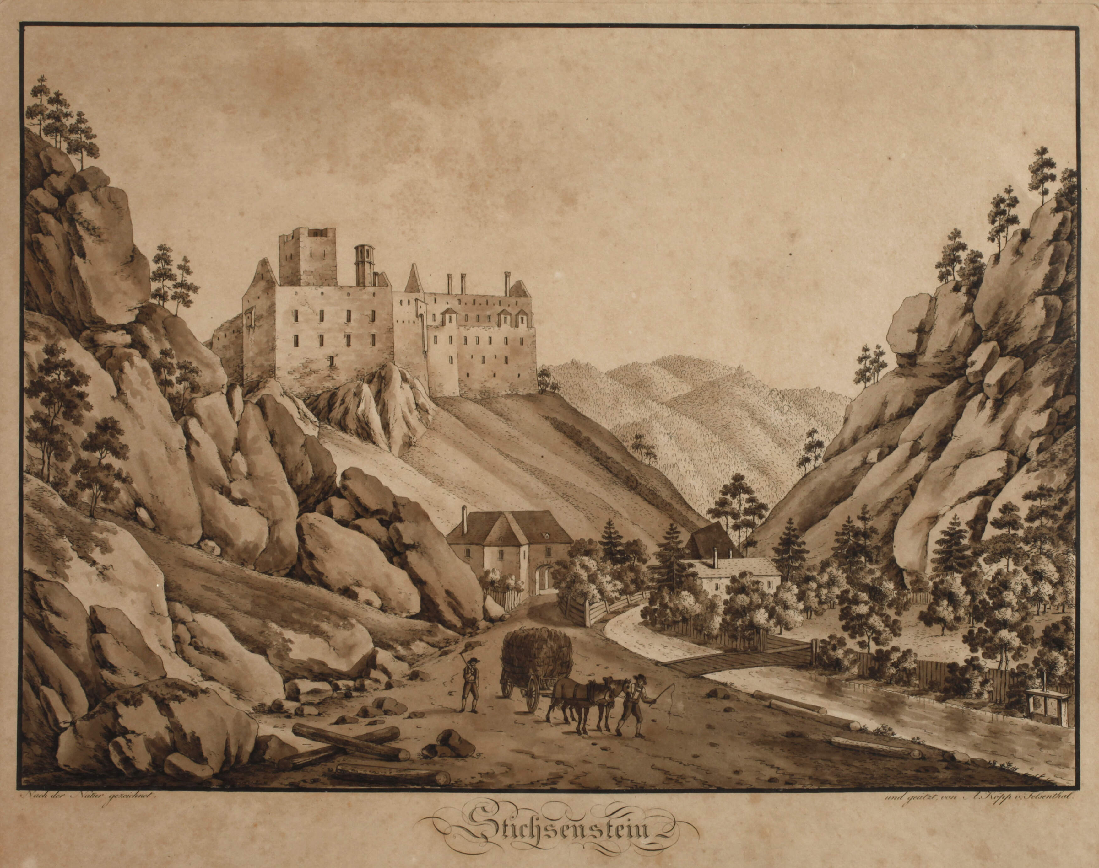 Blick vom Tal der Sierning auf die auf einem Berg thronende Burgruine, im unteren Bereich im Druck betitelt "Stichsenstein", mit Tusche lavierte Radierung, um 1825, am unteren Darstellungsrand bezeichnet "Nah der Natur gezeichnet und geätzt von A. Köpp v. Felsenthal", leicht gebräunt und fleckig, unter Passepartout und hinter Glas gerahmt (Rahmen defekt), Darstellungsmaße ohne Schrift ca. 26 x 37 cm. Künstlerinfo: österr. Zeichner und Graphiker (1766 Wien bis 1826 Wien), Studium am Theresianum und an der Akademie in Wien, ab 1791 Mitglied der Akademie, seit 1797 als Lehrer an der Theresianischen Ritterakademie tätig, Veröffentlichung „Historisch-malerische Darstellungen von Oesterreich“ mit 80 Ansichten von ihm, Quelle: Wurzbach und Wikipedia.