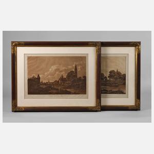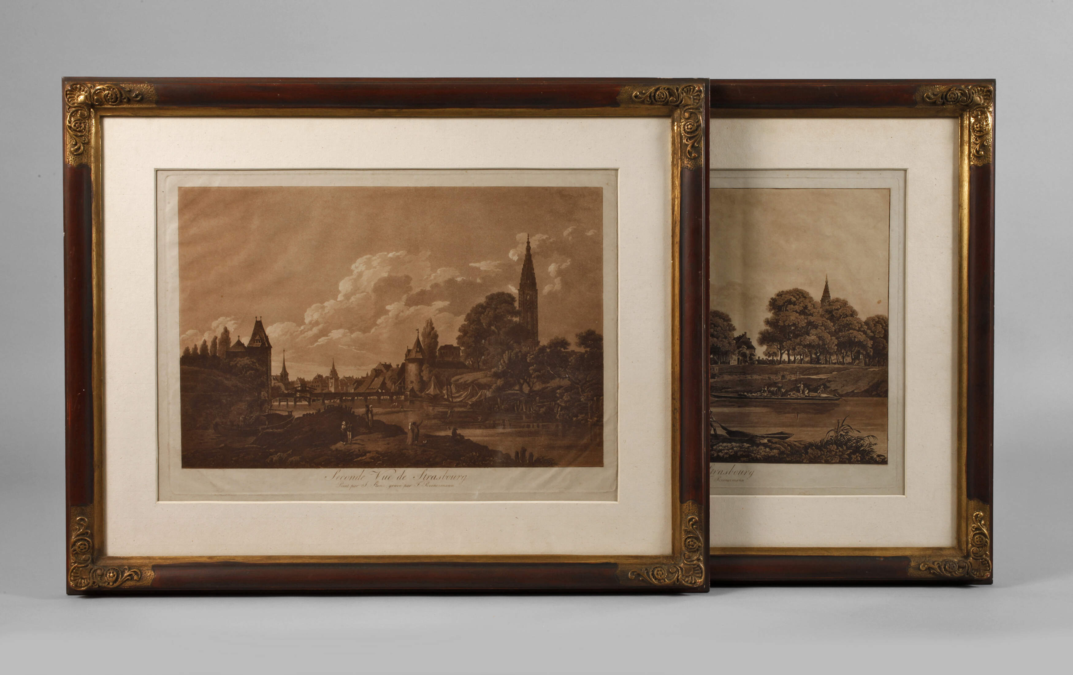 betitelt "Premiere Vue de Strasbourg Paint par J. Stunz, gravé par F. Reinermann" und "Seconde Vue de Strasbourg Paint par J. Stunz, gravé par F. Reinermann", Aquatinta in Braun gedruckt, um 1800, minimal fleckig, ansprechend als Pendants unter Passepartout und hinter Glas gerahmt, Darstellungsmaße ohne Schrift ca. 27 x 41,5 cm. Künstlerinfo, Friedrich Christian Reinermann, dt. Landschaftsmaler und Graphiker (1764 Wetzlar bis 1835 Frankfurt am Main), Schüler von Johann Andreas Benjamin Nothnagel in Frankfurt am Main, 1789 Studienaufenthalt in Kassel und Reise nach Rom, hier Schüler von Louis Ducros, 1793–1803 in Basel tätig, nachfolgend bis 1811 in Frankfurt am Main tätig und 1811–18 in Wetzlar ansässig, 1812 Ernennung zum Professor, ab 1818 Lehrer an der Städelschule in Frankfurt am Main, Quelle: Thieme-Becker und Wikipedia.
