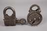 18./19. Jh., ein barockes Schloss mit originalem Schraubschlüssel, dazu vier Vorhängeschlösser 19. Jh., eines gemarkt Hopps & Co. London, normale Altersspuren, L von 11–14 cm.