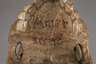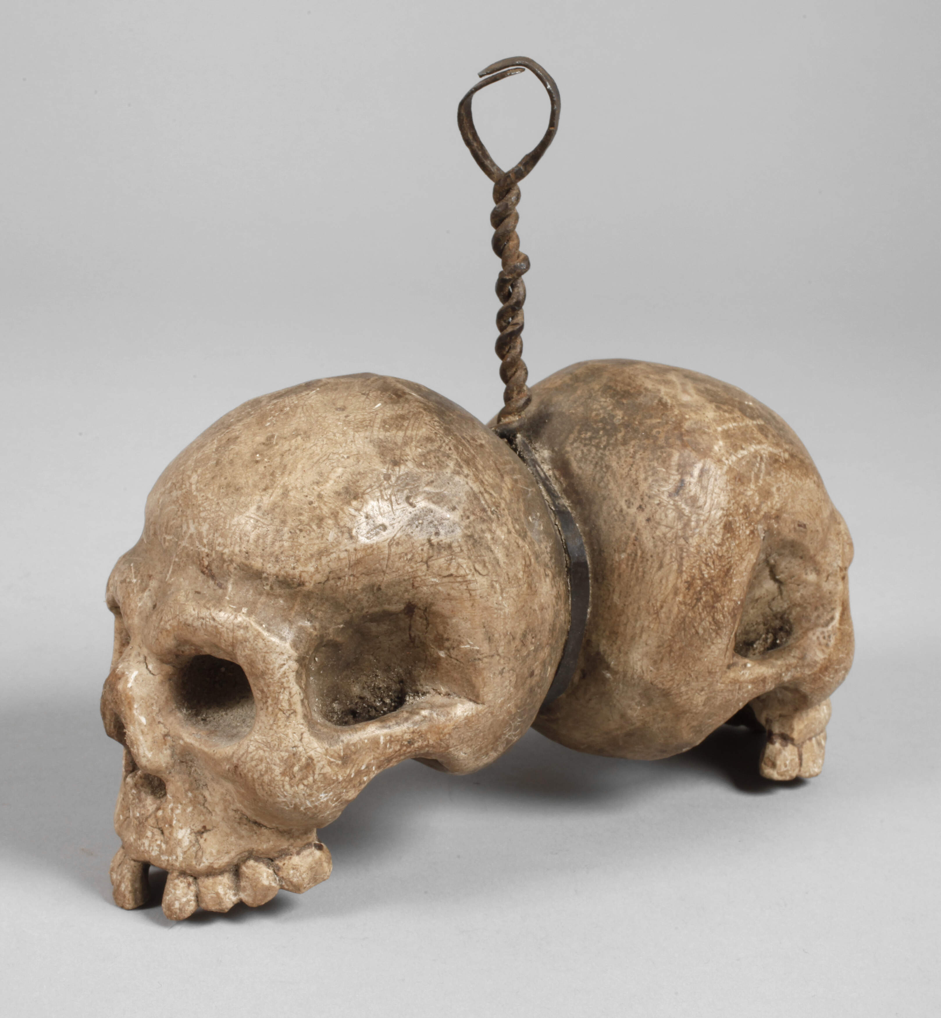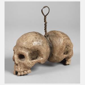 Tirol, datiert 1767, undeutlich bezeichnet, Laubholz beschnitzt, farbig gefasst, zwei plastisch gefertigte Totenschädel mit geschmiedeter Eisenmontierung, Altersspuren, L ca. 20 cm.