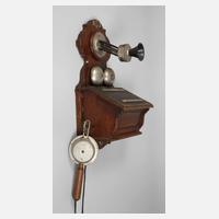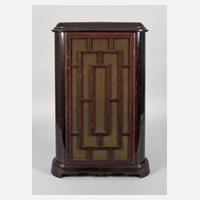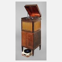 um 1920, ungemarkt, im neoklassizistischen Stil gefertigtes Kleinmöbel mit zweitüriger Front und innenliegender Regaleinteilung, im oberen Drittel textilverkleidete Schallflächen, eingelassenes Grammophon mit verchromten Metallteilen originale Kurbel, funktionstüchtig, Oberfläche mit leichten Alters- und Gebrauchsspuren, beigegeben ca. Platten, Maße 135 x 54 x 55 cm.
