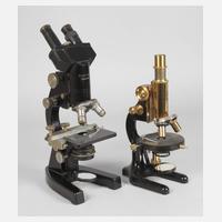 um 1920/30, ein Stereomikroskop gemarkt E. Leitz Wetzlar, Messinggestell schwarz lackiert, vernickelte Beschläge, Revolverobjektiv mit Immersionslinse, Objektträgerfeinverstellung, dazu Mikroskop Carl Zeiss Jena, Nummer 85590, Monokular, vierfach Objektivwechsler, runder Objekttisch mit Feinregulierung, im originalen Kasten mit diversen Wechselokularen, H 40 und 30 cm.