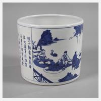 China, 20. Jh., Porzellan-Pinselbecher mit kobaltblauem Unterglasurdekor aus Literaten und Dienern bei der Bildbetrachtung, beim Kalligraphieren, beim Zitherspiel und Brettspiel, Wandung mit Aufschriftgedichten in Normalschrift (chin. KAISHU), Sechszeichenmarke KANGXI, Provenience: Sammlung Günther Stelly, Berlin, H 18,5 cm, D 21 cm.