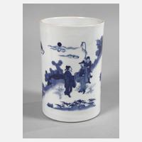 China, 20. Jh., hoher Porzellan-Pinselbecher mit kobaltblauem Unterglasurdekor aus der Begegnung zweier Beamter an kieferbewachsenen Gestaden in einer Vollmondnacht, Ranken- und Wellenbordüre in sogenanntem verborgenen Dekor (chin. ANHUA), Provenience: Sammlung Günther Stelly, Berlin, H 22 cm, D 15 cm.
