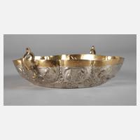 Mitte 17. Jh., Silber gestempelt mit Beschauzeichen Augsburg, Meisterpunze Balthasar Haydt (Meister ab 1645), innen vergoldet, äußerst feine Silbertreibarbeit, ovale Schale mit geschweiftem, leicht nach außen gewölbtem Rand, dieser verziert mit Akanthuslaub, im Spiegel Tafelaufsatz mit Früchtebukett, darauf ein Vogel mit einem Zweig sitzend, seitlich volutenförmige Handhaben, altersgemäß gute Erhaltung mit normalen Gebrauchsspuren, L 14 cm, G ca. 92 g.
