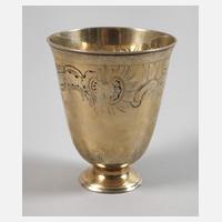 um 1760, Beschauzeichen Berliner Bär, Meisterzeichen IGH für Johann Gottfried Hildebrand (Meister um 1743), vergoldet, kleiner gefußter Becher mit leicht nach außen schwingender Wandung, diese verziert von getriebenen und gestichelten Rocaillen, Fuß von unten alt gelötet, Alters- und Gebrauchsspuren, H 9 cm, G ca. 83 g.