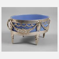um 1793/95, Silber gestempelt Augsburger Zirbelnuss, Meistermarke PFB für Philipp Friedrich Bruglocher, Meister ab 1771, gestorben 1826, zarte klassizistische Schale auf schlanken Füßen, durchbrochen gestaltet und verziert mit Festons, bewegliche Ösenhenkel, herausnehmbarer Einsatz aus hellblauem Milchglas mit geschliffenem Bodenstern, dieser mit durchgehendem Haarriss von ca. 4 cm, sonst guter altersgemäßer Zustand, L 16 cm, G ohne Einsatz ca. 166 g, Quelle: Helmut Seling, Die Kunst der Augsburger Goldschmiede, Band III, Nr. 2531.