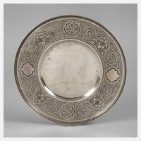 Ende 19. Jh., gestempelt AK unter Krone im Wappen für Alexander Kach (Katsch) St. Petersburg (1865–1915), zwei Kopfpunzen sowie GP (galvano plated), ovales Tablett, im Spiegel ovale Kartuschen zwischen stilisierten Blütenzweigen, darin Ornamentik, Fahne mit umlaufendem Ornamentband, geringe Gebrauchsspuren, L 62 cm.