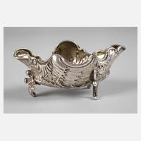 18. Jh., Silber mit Beschaupunze Nürnberg, Jahreszeichen B, leicht verschlagene, unleserliche Meisterpunze ...TR?, Tremolierstrich, auf vier stilisierten Füßen stehender Korpus in Muschelform, unten mittig scharnierter gerippter Korpus mit stilisiertem Akanthuslaub und Muscheln, kleiner Bandhenkel, ein Fuß alt gelötet, sonst altersgemäß sehr gut erhalten mit normalen Gebrauchsspuren, H 8,5 cm, G ca. 125 g.
