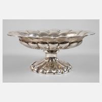 20. Jh., ungedeutete Punzen stilisierte Lilien im Wappen sowie MD im Herz, Silber geprüft, innen Reste alter Vergoldung, godronierte, geschweifte Schale mit Volutenhenkeln, im Boden gedrücktes Früchterelief, etwas verdrückt, kleine Haarrisse, L 15,5 cm, G ca. 89 g.