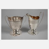 Anfang 19. Jh., große Kanne mit Beschaupunze Berlin mit Buchstabe H?, weiteres Jahreszeichen A, gestempelter Buchstabe N, kleine Kanne undeutlich gepunzt mit Jahreszeichen?, eine mit Schriftzug: "Zum Andenken an den Großvater Musculus. 1841." innen vergoldet, auf kleinen ausgestellten Standbeinen stehende gebauchte Kannen mit vertikal gerippter Wandung, vorspringende Schnaupen, stilisierter hochgeschwungener Griff mit Schwan, Alters- und Gebrauchsspuren, H max. 14 cm, G zusammen ca. 327 g.