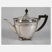 um 1820, Silber gestempelt 13 Lot, weiterer gestempelter Buchstabe J, auf vier angedeuteten Füßen stehende bauchige Kanne mit geschwungener Schnaupe, scharnierter Klappdeckel, gekrönt von einer vollplastischen Mohnkapsel, figürlicher Asthenkel umwunden von einer Schlange, Isolierscheiben aus Bein, bekrönendes Blattwerk nicht ganz komplett, Alters- und Gebrauchsspuren, H 19 cm, L 26 cm, G ca. 656 g.