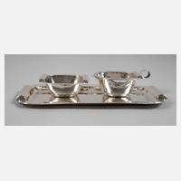 1979, Silber gestempelt Sterling Denmark, Herstellermarke Georg Jensen mit graviertem Schriftzug, mit geprägtem Datum 1904-1979, anlässlich des 75-jährigen Jubiläums, bestehend aus je einem Dessertlöffel, einer Dessertgabel und einem Dessertmesser, mit gerundeten Griffabschlüssen mit aufgelegter stilisierter Blüte, diese mit mittig eingesetztem Karneolcabochon, Hammerschlagdekor, Messerklinge aus rostfreiem Stahl, normale Gebrauchs- und Altersspuren, L max. 16,5 cm, G total ca. 138 g.