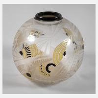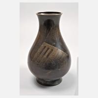 um 1935, am Boden gestempelte Firmenmarke WMF IKORA Germany, Formnummer 20, Musternummer 1289a, Messing braun patiniert mit gekratzten geometrischen Dekoren, auf kleinem konischen Standring ruhende bauchige Vase mit ausschwingender Mündung, nach innen gebogener Rand, partiell etwas grünspanig, Fuß lose, Altersspuren, H 27 cm.