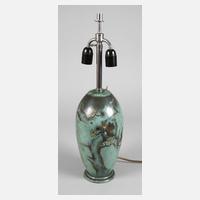 1930er Jahre, Modellnummer 666/1, getreppter Vasenfuß, darüber bauchige Vase aus Messing, Persulfat-schwarz eingefärbt, grün feuerpatiniert, Dekor schattiert bzw. gefräst, zweiflammig alt elektrifiziert, höhenverstellbar, ohne Schirm, Funktion nicht geprüft, H min. 56 cm, H max. 67 cm.