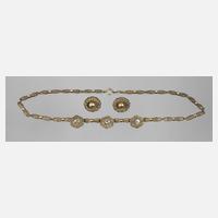 1920er Jahre, Silber vergoldet und gestempelt 925 sowie Marke für Theodor Fahrner, bestehend aus einem Collier mit drei blütenförmigen Zwischenteilen, diese besetzt mit hellblauen facettierten Schmucksteinen, Schmuckglieder in Schleifenform, mit Federringverschluss, L ca. 41 cm sowie ein Paar Ohrclips, mittig besetzt mit goldfarbener Kunstperle, umgeben von facettierten Markasiten, Oberfläche in Optik von kordierten Drähten, leichte Tragespuren, G gesamt ca. 28,5 g.