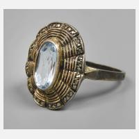 um 1920, Silber gestempelt 925 und Marke für Theodor Fahrner, ca. 19 mm hoher Ringkopf, besetzt mit einem aquamarinfarbenen synthetischen Spinell sowie zahlreichen Markasiten, Reste alter Vergoldung, Tragespuren, RW 18 mm, G ca. 3,9 g.