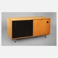 Entwurf Erich Straimann für Ideemöbel, deutsch, 1950er Jahre, rückseitig mit Herstelleretikett, in Esche furniert, eine Schiebetür schwarz gebeizt, mit auffällig strukturierter Oberfläche, das Innenleben in Mahagoni furniert, guter Zustand mit leichten Gebrauchsspuren, Maße 75 x 148 x 45 cm.