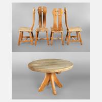 wohl Belgien, 2. Hälfte 20. Jh., Eiche massiv, stabile Hochlehnstühle, die Lehne aus zwei gebogenen Eichenbrettern, die Sitzfläche leicht gewölbt, dazu passender runder Esstisch, mit massiver, 6 cm starker Platte, diese mit sichtbar eingelassenen Schwalbenschwanzverbindungen, normale Alters- und Gebrauchsspuren, Maße Tisch H 74 cm, D 113 cm, Maße Stuhl H 112 cm, SH 45 cm.