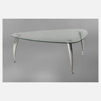 1990er Jahre, ungemarkt, nierenförmige Glasplatte, getragen von drei leicht gebogenen Beinen aus verchromtem Aluminiumguss, auf Rollen gelagert, Maße 49 x 75 x 122 cm.