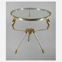 Frankreich, 2. Hälfte 20. Jh., runder Tisch mit eingelegter Glasplatte, auf drei gebogenen Beinen aus gebürstetem Stahlrohr, verziert mit Pferdeköpfen aus Messingguss, guter Zustand, H 71 cm, D 67 cm.