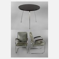 deutsch, 1950er Jahre, bestehend aus zwei Stahlrohrsesseln, Modell RS 7, und einem passenden runden Beistelltisch, die Sessel mit grünem Lederbezug und geschwärzten Armauflagen aus massiver Buche, der runde Beistelltisch mit originalem Herstelleretikett Mauser Werke Waldeck, guter Zustand mit Gebrauchsspuren, Maße Sessel 90 x 55 x 74 cm.