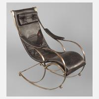 nach einem Entwurf von Peter Cooper für R. W. Winfield & Co, England, um 1860, Reedition Mitte 20. Jh., Gestell aus Bandeisen mehrteilig verschraubt, im Kniebereich mit Holzauflage, eingehängtes Lederpolster mit Nackenkissen und Armauflagen, Hutmuttern aus Messing, guter Zustand mit Alters- und Gebrauchsspuren, Maße 106 x 60 x 90 cm. Quelle: G. Himmelheber, Möbel aus Eisen, Abb. 356.