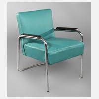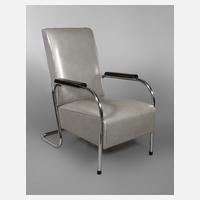 1930er Jahre, ungemarkt, z-förmiges Gestell aus verchromtem Stahlrohr, Armauflagen aus geschwärztem Buchenholz, originales graues Kunstlederpolster, Chrom Z 2, normale Alters- und Gebrauchsspuren, Maße 91 x 61 x 82 cm.