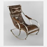 nach einem Entwurf von Peter Cooper für R. W. Winfield & Co., England, um 1860, Reedition Mitte 20. Jh., Gestell aus Bandeisen mehrteilig verschraubt, im Kniebereich mit Holzauflage, eingehängtes Lederpolster mit Nackenkissen und Armauflagen, Hutmuttern aus Messing, guter Zustand mit Alters- und Gebrauchsspuren, Maße 106 x 60 x 90 cm. Quelle: G. Himmelheber, Möbel aus Eisen, Abb. 356.