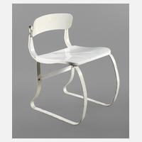 1938 für Ironite Inc. USA, Gestell aus Bandstahl verschraubt, Sitz und Lehne aus geprägtem Eisenblech, weiß- und cremefarben lackiert, Lehne als Lordosenstütze, Alters- und Gebrauchsspuren, H 65 cm, SH 41 cm. Quelle: A. Drechsler, G. Daniel, Design from the Collection of the Museum of Modern Art, New York, 1959, S. 60.