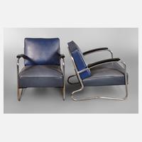 1950er Jahre, schwere Polstersessel mit aufwendig gebogenem Gestell, schwarz lackierte Armauflagen, originaler blauer Kunstlederbezug mit schwarzem Keder, Chrom Z 2-3, Maße 77 x 64 x 83 cm. Quelle: O. Macel, 2100 Metal Tubular Chairs, S. 176/177.