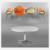 Ausführung Hermann Miller, 1970er Jahre, bestehend aus rundem Ausziehtisch und vier DAX-Schalensesseln mit originalen orangefarbenen Sitzbezügen, die Stühle an der Unterseite mit Herstelleretikett, Gestelle der Stühle mit Flugrost, Bezüge verblichen, teilweise verschmutzt, dazu runder Ausziehtisch mit einer separaten Einlegeplatte, in gutem Zustand, Maße Tisch H 71 cm, D 120 cm, L max. 165 cm.
