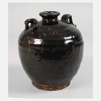im Stil der Song-Dynastie, ungemarkt, heller Scherben mit glänzend schwarzer Spiegelglasur, kugeliger Korpus, auf der Schulter zwei kleine Schlaufenhenkel, schmaler Hals mit leicht ausgestülpter Mündung, stark brandfleckig, Altersspuren, Substanzverluste, H ca. 22 cm.