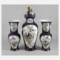 China, 19. Jh., ungemarkt, Porzellan in kobaltblauer Unter- und polychromer Aufglasurbemalung sowie Goldstaffage, zentrale Deckelvase mit zwei passenden Beistellern, schlanke Balusterkorpora, Front und Rückseite jeweils von Kartuschen verziert, welche Vogeldarstellungen in Landschaften zeigen, gute Erhaltung mit leichten Altersspuren, H 75 und 51 cm.