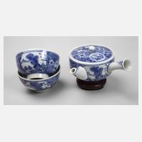 Japan, Anfang 20. Jh., teils gemarkt, Porzellan in kobaltblauer Unterglasurbemalung, Miniaturkännchen und zwei Koppchen, verziert von Landschaftsmotiven und Rankwerk, beigegeben beschnitzter Holzsockel, winzigst bestoßen, H max. 6,5 cm.