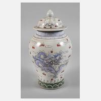 wohl Ende 19. Jh., am Boden mit Sechs-Zeichen-Kangxi-Marke, Porzellan in polychromer Emaillebemalung mit Drachenmotiv und Fledermausdarstellungen in stilisierter Landschaft, Balusterkorpus mit stark gewölbtem Deckel und zapfenförmigem Knauf, leichte Altersspuren, H ca. 40 cm.