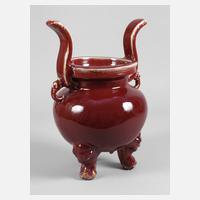 um 1900, ungemarkt, rötlicher Scherben in kraftvoller, sehr gleichmäßiger Ochsenblutglasur, stark gebauchter Korpus auf drei kurzen geschwungenen Füßen mit reliefierten Löwenköpfen, kurzer zylindrischer Hals mit leicht ausgestellter Mündung, zwei s-förmig geschwungene blattartige Handhaben, Füße mit kleinen Substanzverlusten, H ca. 38 cm.